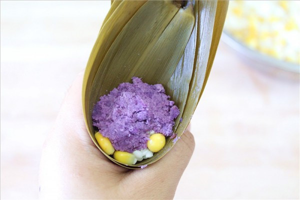 紫薯玉米香粽的做法步骤6.放一块紫薯泥压实。